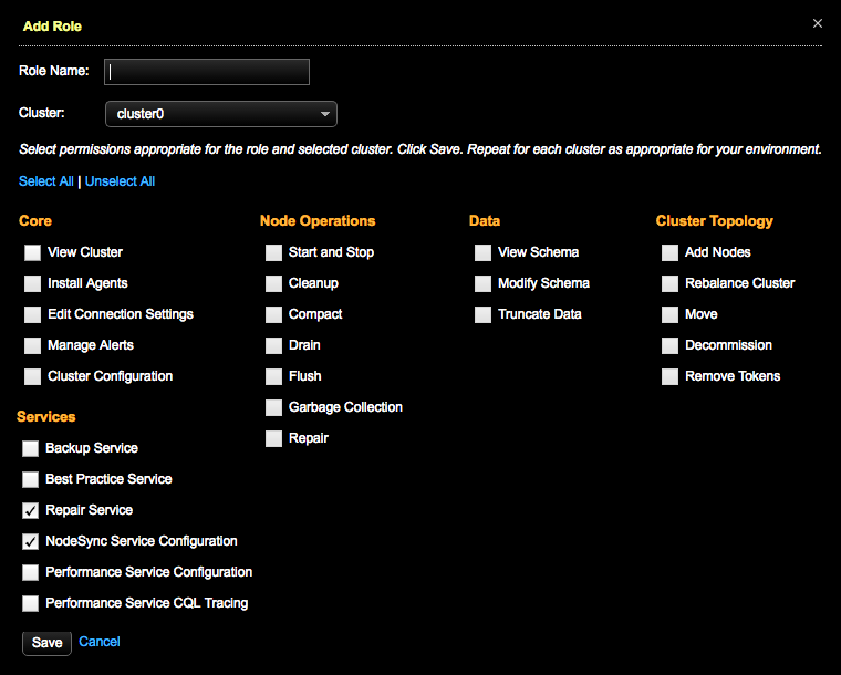 Only those assigned an admin role can manage roles. Each role represents permissions for all clusters managed by OpsCenter. Any functionality in OpsCenter that a user does not have permission for appears as gray and unavailable to that logged in user.