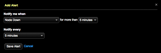- From the Notify me when menu, choose Node Down and select the duration of the condition before alerting.