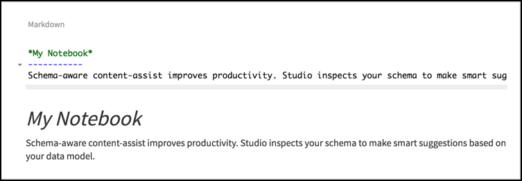 My Notebook ----------- Schema-aware content-assist improves productivity. Studio inspects your schema to make smart suggestions based on your data model. When you work with properties of a person, then you'll see suggestions for name and date_of_birth.